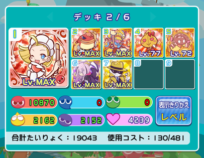 以下のデッキは現状では基本的に510-700まで用。 300までは弱点殴り、500までは1発攻撃もらうまで9倍or6倍の盾無し色での等倍殴りでいずれも攻撃力重視の編成でよい。 黄色での9倍ループデッキ例。ボスシリーズ☆6リダサポではHP最大時のみ攻撃力が9倍になるため、 回復スキル持ちを入れてスキルがたまったタイミングで全回復することによって一気に大ダメージを与えることができる。 スキルを貯められれば4倍の時よりも大ダメージになり、またリダサポがバランスタイプなので回復も安定しやすい。 このデッキではガールズ優先でフルーティーナにしたが、即時回復の魚王子(人間)を採用してもよい。 基本的には初代砲1ループ打ったら報告なし撤収でよい。 1ループ撤収なのでウンディーネ単挿しの代わりにウィッチ2枚目を入れてもよい。(以降の別色のデッキ例でも同じ) ボス持ってない場合は2倍リーダーで代用して6倍。 黄色でのリーダーウィッチでの殴りループ例。リダサポウィッチにして対黄色追撃やぞう大魔王戦、710以降攻撃あがるまでの10nに使う。 無理に毒狙うよりは安定する場合もあり。 またインギール単挿しすることで割合ダメージも欲張って狙っているが、無理にインギールを入れず他のステ高いキャラにしてもよい。 紫での9倍殴りループデッキ例。9倍ループでは紫の方がコンビはつけやすいのでこちらが主流になるかもしれない。 紫でのリーダーシェゾでの殴りループ例。ダークアルルのかわりにグリープで割合ダメージを狙ってもよい。 青での9倍殴りループデッキ例。黄紫毒盾相手は基本はこちらで。ウンディーネと色をそろえるための青。 青でのリーダーアルルでのループ例。連鎖頑張れば終盤のぞう大魔王などにも大ダメージを与えられるかも。